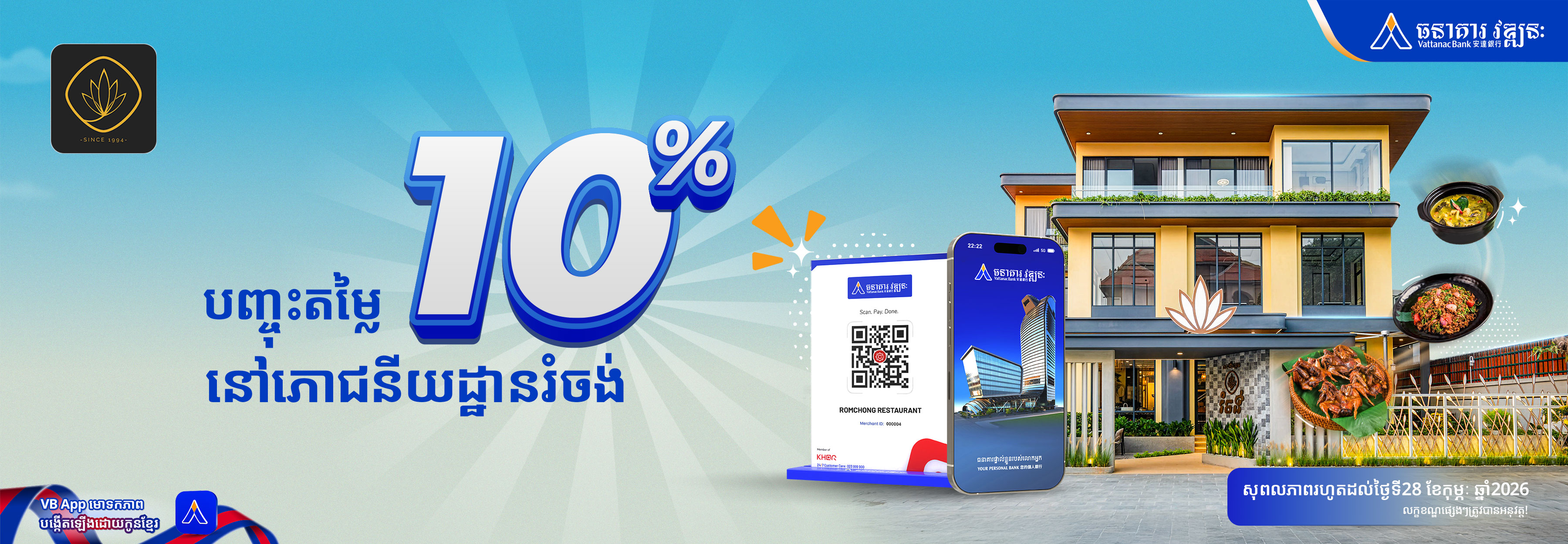 Discover the true essence of Cambodian cuisine at Rumchong Restaurant and enjoy an exclusive 10% discount on all food items when paying with VB KHQR via the VB App. (Food items only — drinks not included.)